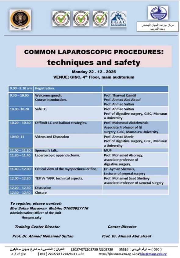 تقرر إنعقاد ورشة عمل بمركز جراحة الجهاز الهضمى بالمدرج بالدور الرابع وذلك يوم الإثنين الموافق 22/12/2025 فى تمام التاسعة صباحا